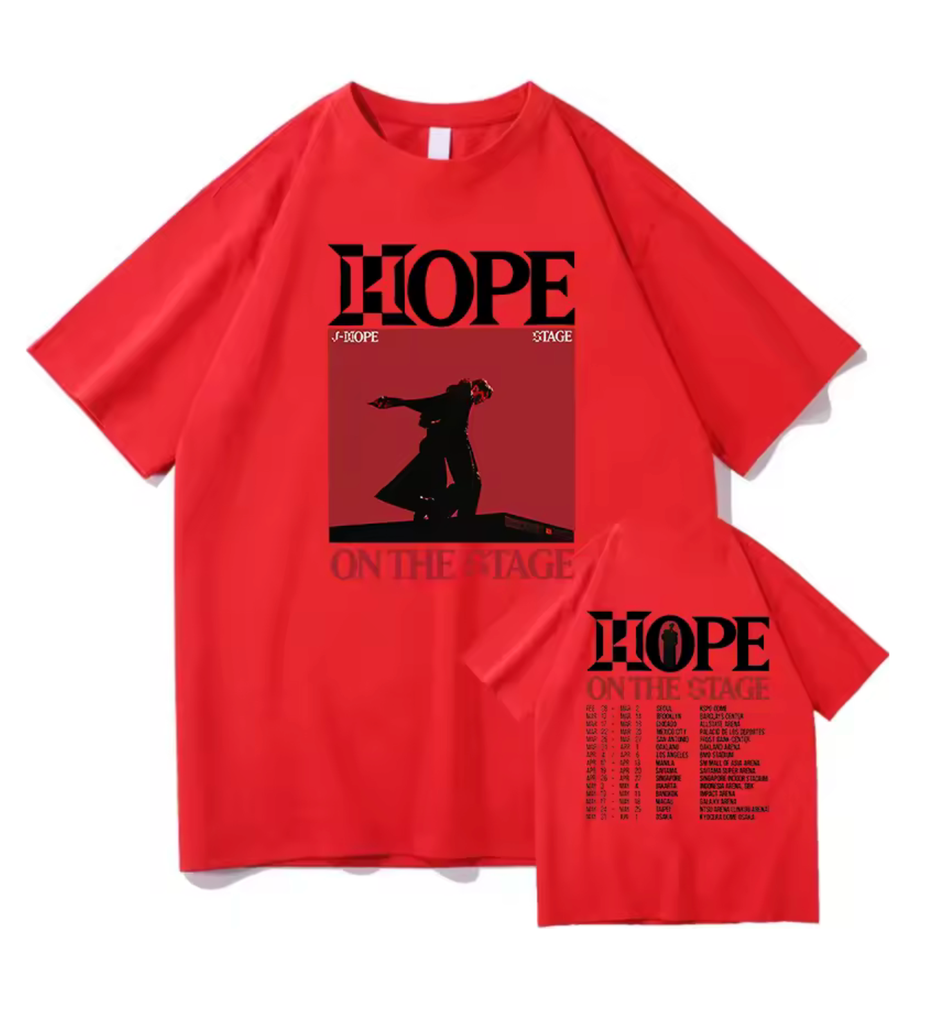 This bold black T-shirt features a striking red silhouette of J-Hope mid-performance, radiating pure stage energy. With front and back prints showcasing tour dates and cities, it’s more than just merch—it’s a wearable memory for true fans.